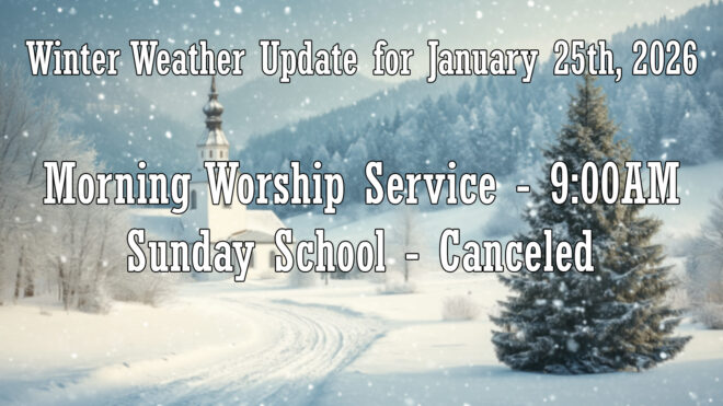 Due to severe weather predicted on Sunday January 25th, 2026 the morning worship service will be held at 9:00am and the Sunday school classes will be canceled. Please exercise caution if you choose to travel.
